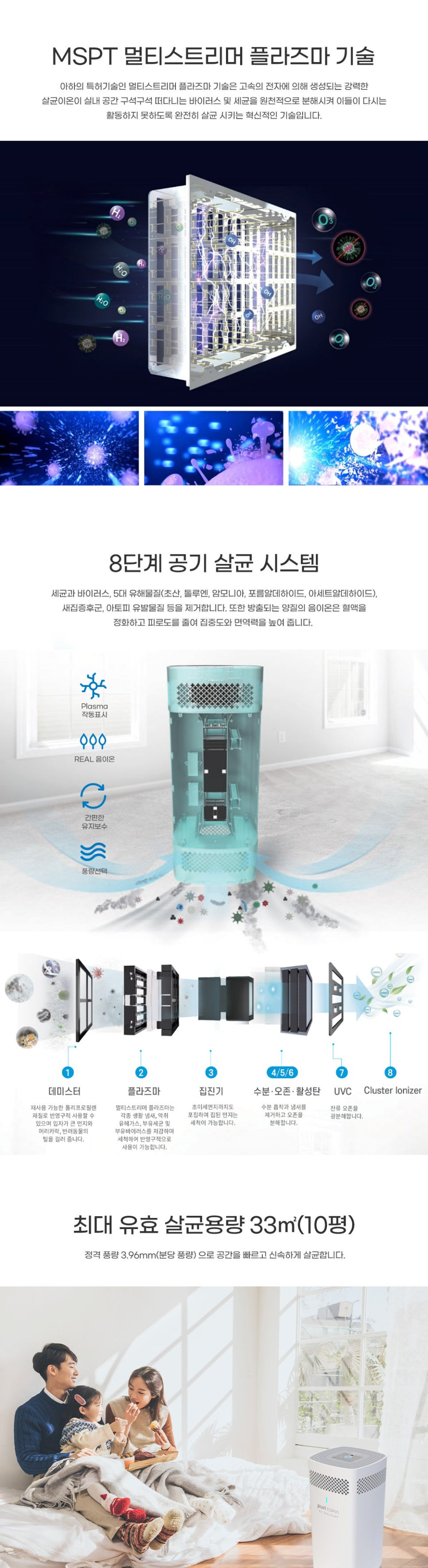 - 강력한 플라즈마 살균력: 공기 중 유해 세균, 바이러스, 곰팡이 등을 효과적으로 제거하여 언제나 깨끗하고 건강한 공기를 유지합니다.