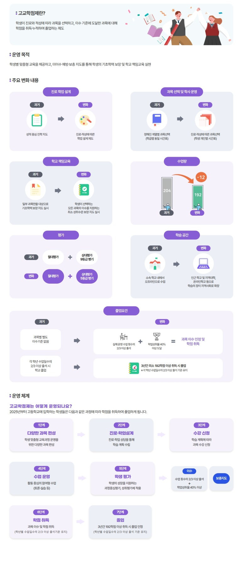 - 정의: 학생이 진로에 따라 과목을 자유롭게 선택하고, 각 과목의 이수 기준(성취 수준)에 도달하면 학점을 취득합니다. 누적 학점이 졸업 기준(최소 192학점)을 충족하면 졸업이 인정됩니다.