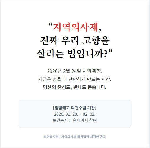 #지역의사제 #보건복지부 #입법예고 #의료법 #지역의사양성법 #필수의료 #공공의료 #의료격차해소 #의견수렴 #국민참여 #의대입시 #2027대입 #의예과 #입시정보 #수험생 #고3 #학부모 #지역인재전형 #의대진학 #의사면허 #내고향 #지역살리기 #지방시대 #상생 #우리동네의사 #의료취약지 #뉴스브리핑 #카드뉴스 #정책홍보 #꼭알아야할정보