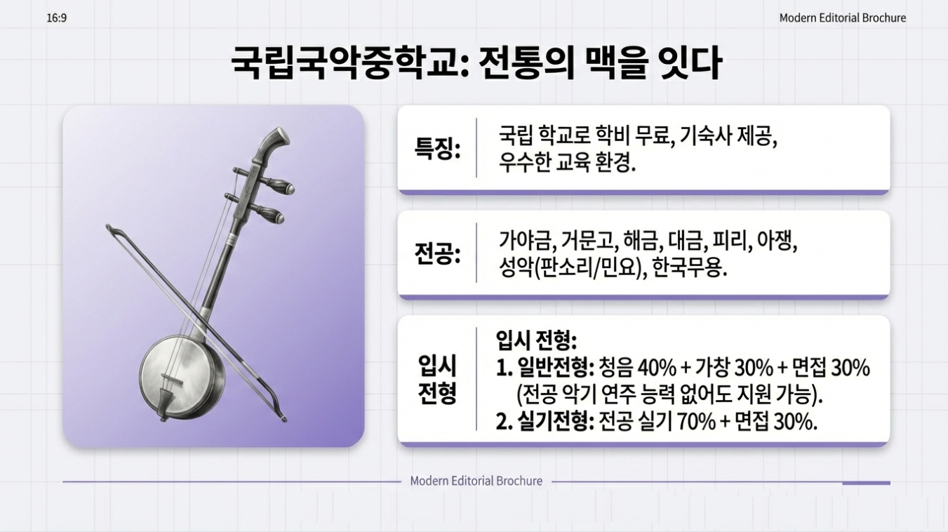 - 국립국악중 / 국립전통예술중 (서울): 국립 기관으로 국악과 전통 예술 분야에서 독보적이며, 학비가 저렴하거나 국비 지원 혜택이 큽니다.