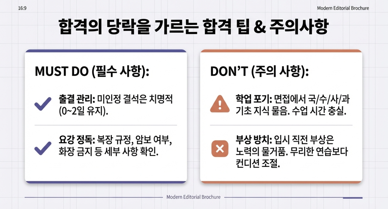 - 성실성 지표: 출결 점수에서 1~2점 감점된 학생이 불합격하는 사례가 증가하여, 학교 생활 관리가 필수임을 입증했습니다.