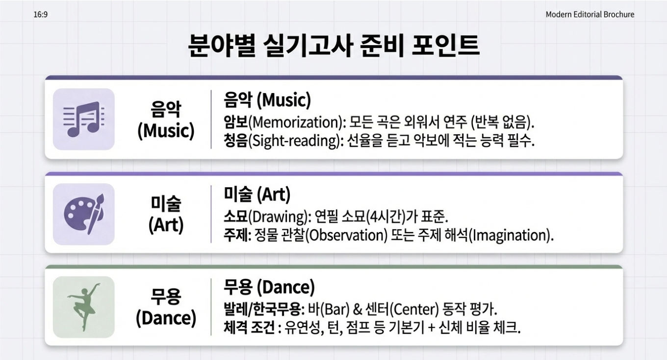 - 음악/미술/무용: 실기고사(60~80%) + 구술면접(10~20%) + 출결(성실성)