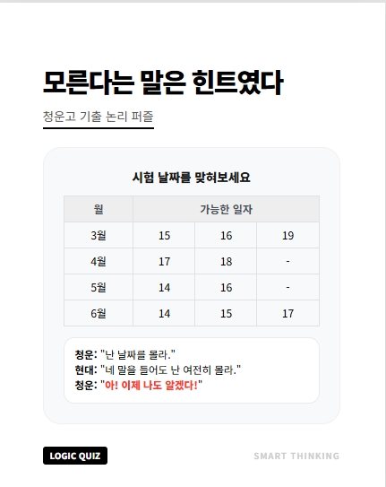 이 문제는 두 사람이 알고 있는 정보(청운이는 '월', 현대는 '일')를 바탕으로 대화를 통해 불가능한 경우의 수를 하나씩 지워나가는 논리 퍼즐입니다.
