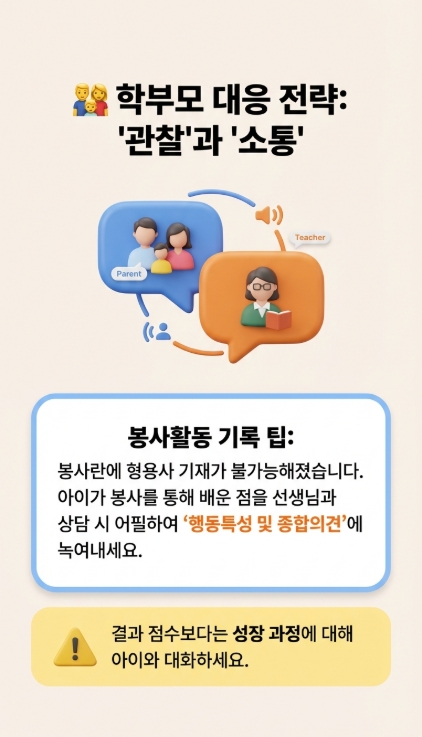 - 창의적 체험활동: 자율·동아리·봉사·진로활동의 영역별 특기사항은 교사가 상시 관찰한 내용을 바탕으로 학생의 성장이 드러나게 작성하며, 학교 교육계획 이외의 사적 봉사활동 실적은 입력하지 않습니다.