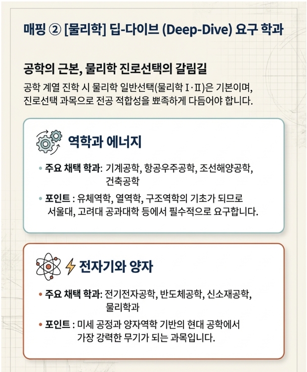 자연과학/공학계열: 미적분II와 기하를 핵심 권장과목으로 지정. 물리, 화학 진로선택 과목 3과목 이상 이수 강력 권장.