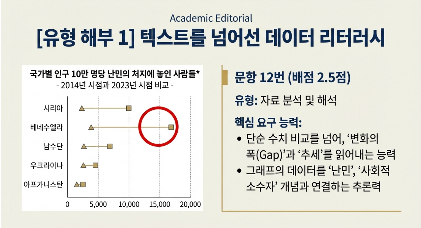 - 변별력: 통계 자료의 수치 변화를 파악하거나, 제시된 관점(윤리적, 공간적, 시간적, 사회적)을 정확히 적용하는 능력이 점수를 가릅니다.